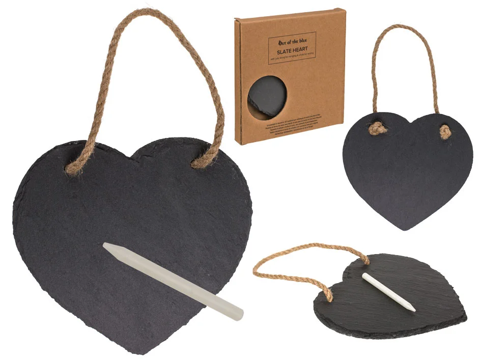 ardoise en forme de coeur avec bande en jute pour accrocher & craie pour écrire