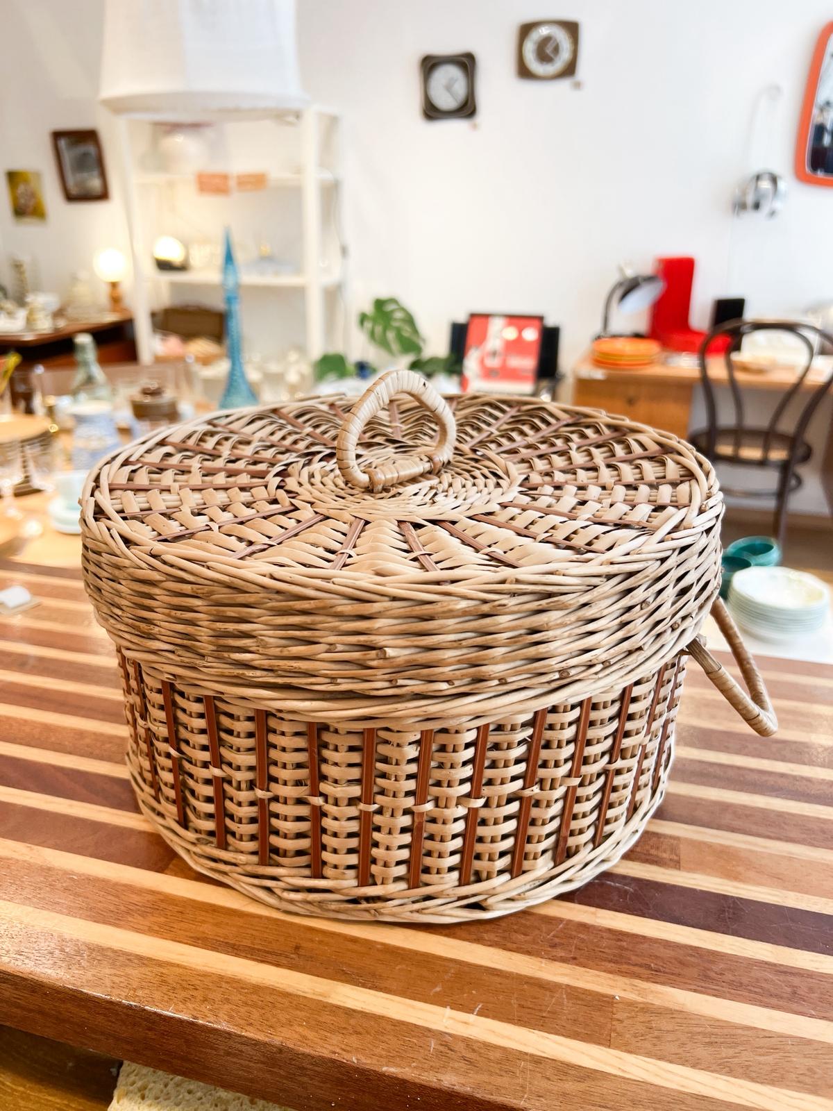 Charmante boîte de rangement vintage en osier – Très bon état. Diamètre : 26 cm ; Hauteur : 14 cm