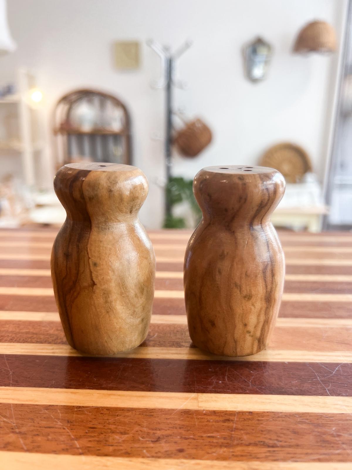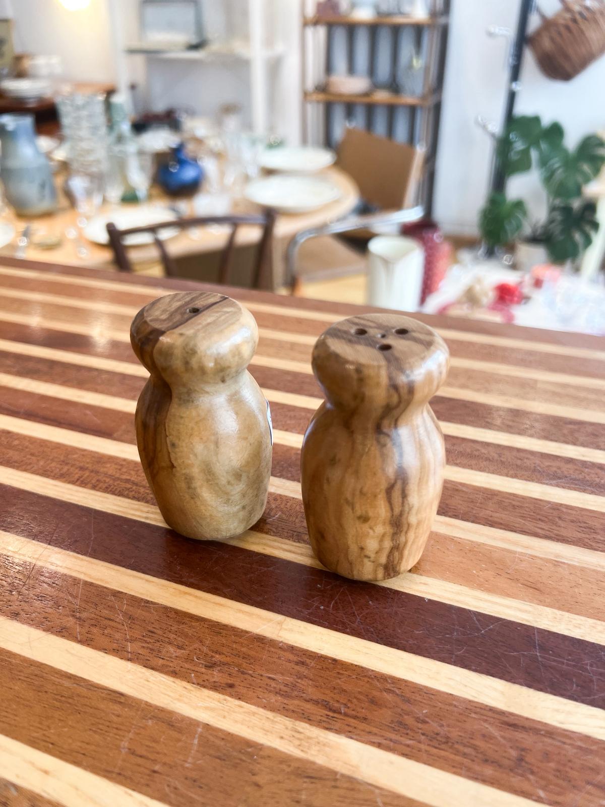 Duo de salière et poivrier vintage en bois d’olivier. Très bon état. Hauteur : 7,5 cm