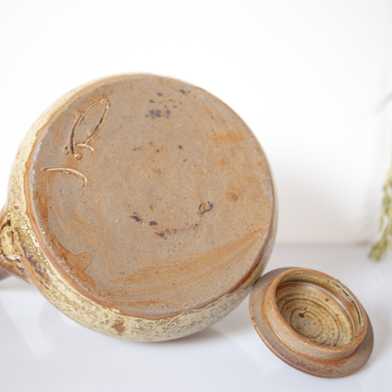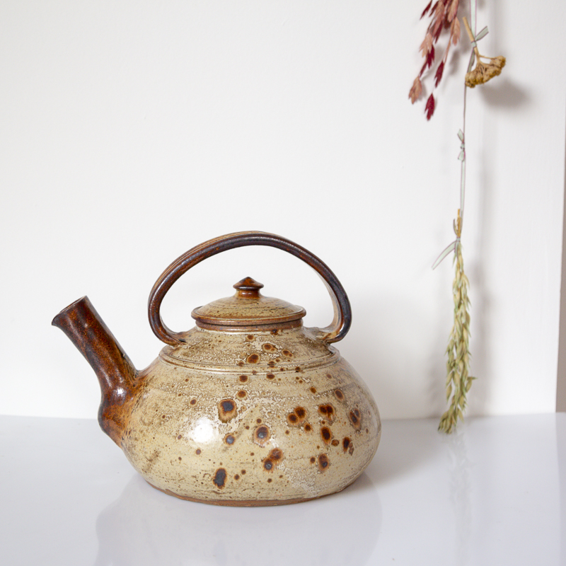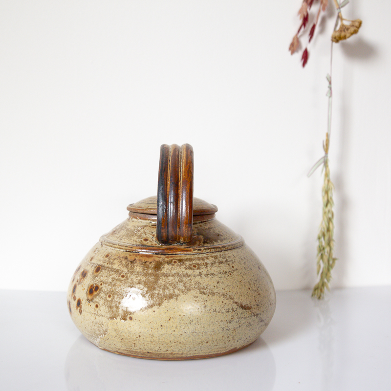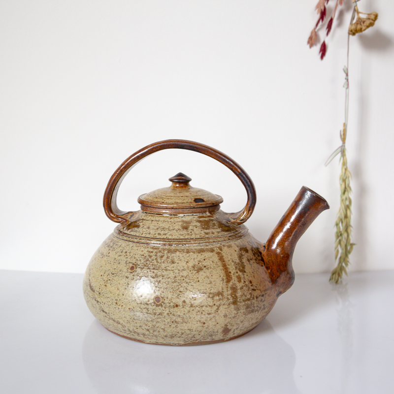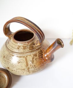 Théière en grès pyrité, datant des années 70-80. Elle est signée « JP » sur son socle. La théière en parfait état, idéale en cuisine ou en décoration.