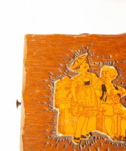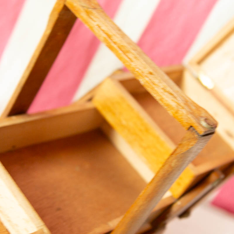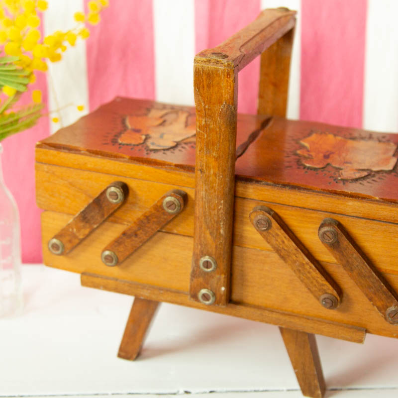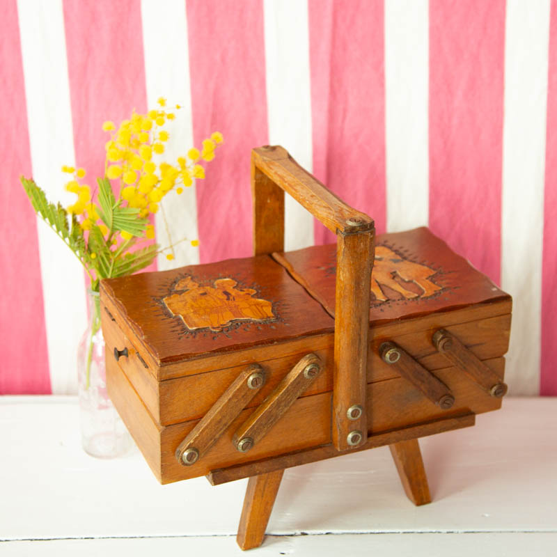 Petite travailleuse couture en bois sur pied. Un décor avec 2 personnages de chaque coté, collé, est présent.